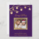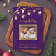 Celebre la alegría de la temporada con esta elegante tarjeta plana de "Felices Fiestas". El fondo rico y profundo púrpura está adornado con estrellas doradas brillantes y delicados adornos, evocando un sentido de asombro festivo. Un hermoso marco dorado acentúa perfectamente su preciada foto familiar, lo que hace que esta tarjeta sea un verdadero recuerdo personal. Debajo de la foto, el nombre de su familia y los nombres individuales se muestran elegantemente en escritura dorada brillante, lo que añade un toque personal a sus saludos navideños. Esta tarjeta es perfecta para enviar cálidos deseos a amigos y seres queridos durante la temporada navideña.