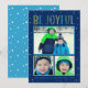 Difunde vibras invernales alegres con esta tarjeta de vacaciones con el mensaje en negrita “Be Joyful” encima de un moderno colage de tres fotos. La tipografía juguetona y colorida resalta contra un fondo de nevada azul marino profundo para un aspecto divertido y apto para niños. Personaliza con tus fotos favoritas y la línea de tu familia para un saludo brillante y feliz. La parte trasera presenta un patrón de puntos de nieve azul brillante coordinado para un acabado limpio y festivo.