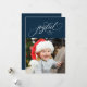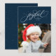 Y un guión elegante "alegre" está rodeado de estrellas brillantes en esta tarjeta de vacaciones de una sola foto. Personalízalo con tu nombre y/o saludo y foto. Perfecto para enviar Navidades a sus amigos y familiares. El respaldo es un azul marino a juego salpicado con las estrellas brillantes coordinadoras. El color se puede ajustar haciendo clic en "personalizar más adelante".