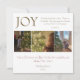 Esta tarjeta de Navidades presenta un diseño sencillo con la palabra "Alegría" como punto focal principal y una combinación de colores dorados y burdeos. El verso de Lucas 2:10 - "Y el ángel les dijo: "No temáis, pues he aquí, os traigo buenas noticias de gran alegría que serán para toda la gente" está situado en la parte superior derecha con una letra delicada. Hay espacio para tres fotos familiares, así como la oportunidad de escribir tu propio saludo. ¡Te deseo todas las bendiciones de la temporada!