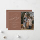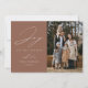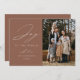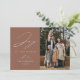 Tarjeta fotográfica de vacaciones moderna con la frase "Alegría por el mundo" en un elegante guión blanco con un fondo moreno de mocha. Personalice la parte delantera de la elegante tarjeta de vacaciones con su nombre familiar, año y foto vertical.