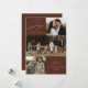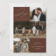 Tarjeta de vacaciones moderna con la frase "Alegría para el mundo" en elegante letra blanca sobre fondo marrón. La parte delantera del diseño presenta 3 de tus fotos familiares favoritas dispuestas en un formato de collage. Personaliza la parte frontal de la tarjeta de vacaciones con varias fotos con tu nombre familiar y el año. La tarjeta se invierte para mostrar una foto adicional.