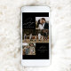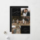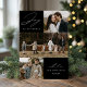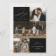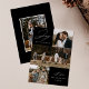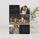 Tarjeta de vacaciones moderna con la frase "Alegría para el mundo" en elegante letra blanca sobre fondo negro. La parte delantera del diseño presenta 3 de tus fotos familiares favoritas dispuestas en un formato de collage. Personaliza la parte frontal de la tarjeta de vacaciones de varias fotos con el nombre de tu familia y el año. La tarjeta se invierte para mostrar una foto adicional.