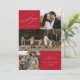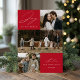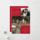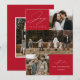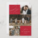 Tarjeta de vacaciones moderna con la frase "Alegría para el mundo" en elegante letra cursiva blanca sobre fondo rojo. La parte delantera del diseño presenta 3 de tus fotos familiares favoritas dispuestas en un formato de collage. Personaliza la parte frontal de la tarjeta de vacaciones de varias fotos con el nombre de tu familia y el año. La tarjeta se invierte para mostrar una foto adicional.