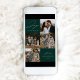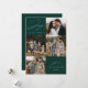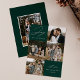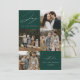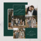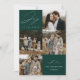 Tarjeta de vacaciones moderna con la frase "Alegría para el mundo" en elegante letra cursiva blanca con fondo verde abeto. La parte delantera del diseño presenta 4 de tus fotos familiares favoritas dispuestas en un diseño de collage. Personaliza la parte frontal de la tarjeta de vacaciones de varias fotos con el nombre de tu familia y el año. La tarjeta se invierte para mostrar una foto adicional.