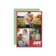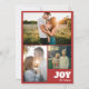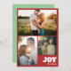 El diseño presenta texto moderno y negrita que dice "Alegría" con una plantilla personalizada de nombre de familia en elegante letra manuscrita y una tarjeta de felicitación de collage de tres fotos. El rojo vintage con verde menta añade un toque moderno, lo que la convierte en un recuerdo perfecto para sus seres queridos.