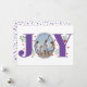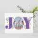 Alegría morada con Navidades de bayas foto tarjeta de vacaciones. Muestra la palabra "JOY" con bayas rojas y vegetación mientras que en lugar de la letra "O" está su foto. La parte trasera incluye puntos de polka morado.