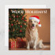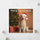 Una encantadora tarjeta de felicitación navideña que presenta a un simpático golden retriever con un sombrero de Santa, irradiando alegría navideña mientras se sienta junto a un deslumbrante árbol de Navidad adornado con adornos y luces. Los regalos envueltos añaden un toque festivo, creando una escena conmovedora y caprichosa.