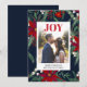 Alegría tipografía Navidad chic patrón verde rojo con flores de poinsettia, muérdago acuarela, agregue su foto para enviar sus saludos navideños y de Navidad.