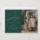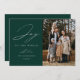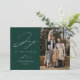 Tarjeta fotográfica de vacaciones moderna con la frase "Alegría al mundo" en un elegante guión blanco con un fondo verde fresco oscuro. Personalice la parte delantera de la elegante tarjeta de vacaciones con su nombre familiar, año y foto vertical.