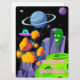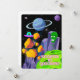 TARJETA FESTIVA ALIENÍGENA, UNIVERSO, COHETE, PLANETA Y ASTRONAUTA