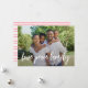 Tarjeta fotográfica simple, divertida y moderna que lee LOVE PEACE FAMILY en un guión elegante, con su nombre y año a continuación. En la parte trasera hay rayas acuáticas dibujadas a mano en rojo festivo.