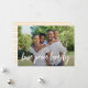 Tarjeta fotográfica simple, divertida y moderna que lee LOVE PEACE FAMILY en un guión elegante, con su nombre y año a continuación. En la parte posterior hay rayas acuáticas dibujadas a mano en naranja amarillo cálido.