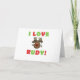 Tarjetas de saludo de renos, bolsas de tote de reno y otros artículos de vacaciones de renos con texto rojo y verde que dice "¡Amo a Rudy!".