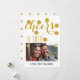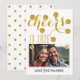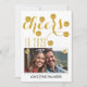 Festín moderno a las bolas purpurinas de oro de 2026, tarjeta de foto plana de Año Nuevo. Muestra el texto "Saludos al 2026" en purpurina de oro con bolas de oro con brillo metálico y una foto con dos pines de oro y sombra. En la parte trasera hay un patrón de puntos polka de puntos dorados sobre blanco.