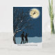 Aniversario de bodas en Navidad, tarjeta de felicitación de papel. Ilustración de una pareja caminando de noche en la nieve y viendo una silueta de ciervo contra la luna. Tema de la temporada de invierno. Imagen y verso © Shoaff Ballanger Studios / 2015.