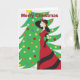 Un árbol de navidad lleno de muchas bombillas y un chica con un viejo vestido rojo y gorra de moda.