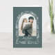 Este diseño único presenta una plantilla de foto con forma de arco de moda con un borde botánico invernal dibujado con línea blanca sobre un fondo verde salvia.