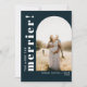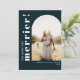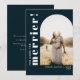 Una divertida tarjeta de anuncio de embarazo con tu foto favorita en forma de arco y "the more the merrier!" en fuente blanca sobre fondo navy. Puedes agregar un mensaje opcional al reverso.