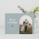 Tarjeta fotográfica de Navidad minimalista y limpia con un arcos azul de piedra con un texto de tipografía que dice "Feliz Navidad" con un simple ilustracion de bayas rojas.