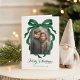 Envía buenos deseos con estilo atemporal con esta elegante tarjeta de Navidad con tema de arco verde. Con una cinta de satén pintada a mano en verde oscuro, este diseño clásico enmarca tu foto familiar con encanto festivo y sofisticación. Perfecta para compartir saludos navideños sinceros con amigos y seres queridos.