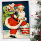 Pasa la alegría de las vacaciones con esta vintage tarjeta de Navidad de mediados de siglo que muestra a Santa Claus en una nieve en la casa preparándose para bajar por la chimenea con una bolsa llena de juguetes. Personalice personalizando el mensaje en la parte posterior y/o agregando su(s) nombre(s), o deje estos campos en blanco si prefiere escribir su propio mensaje y firmas.