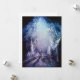 A la entrada de una cueva de cristal, una figura solitaria está de pie, como preparándose para volar hacia arriba, hacia la luz, junto con otras formas humanas en el aire. Abierto a su interpretación.