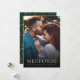 Estas elegantes tarjetas de fotografía navideñas cuentan con una plantilla de fotografía con todo tipo de hemorragia, una tipografía moderna y sencilla para tu apellido y un patrón floral dibujado a mano en la parte posterior con colores clásicos de rojo, verde y marfil sobre un fondo verde oscuro. Una superposición de gradiente oscuro en la parte inferior permite que el texto se destaque contra cualquier foto - ajustar según sea necesario. Fácil de personalizar para hermosas tarjetas de vacaciones que cautivarán a toda tu familia y amigos.