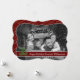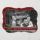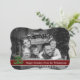 Un moderno diseño de tarjetas de Navidades de fotografía con una foto familiar que llena la cara de la tarjeta y se convierte automáticamente en blanco y negro. Arte moderno divertido decoración de árbol de Navidad con banda de texto rojo oscuro para tus palabras.