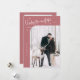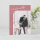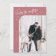 Tarjeta navideña mínima y caprichosa para los recién casados que celebran su primera Navidad juntos como marido y mujer, con un texto que dice "Bajo el Mistletoe para siempre" en la parte superior de la foto con una esquina curva. El fondo es rosa.