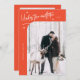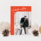 Tarjeta navideña mínima y caprichosa para los recién casados que celebran su primera Navidad juntos como marido y mujer, con un texto que dice "Bajo el Mistletoe para siempre" en la parte superior de la foto con una esquina curva. El fondo es rojo.