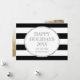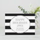 Tarjeta de fotos de la familia de Navidades Felices en rayas blancas y negras con detalles de plata y texto personalizado.