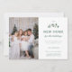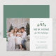 Una tarjeta de Navidad familiar elegante y refinada, simple, de cambio de dirección con una plantilla para una foto, que presenta un pequeño elemento botánico de invierno: una rama de bayas de nieve blancas y verdes. Una tarjeta de Navidad encantadora y botánica de 'nos hemos mudado' que puedes personalizar con tu nombre(s), el año y una foto familiar (o foto de los niños, etc.).