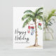 Get into the holiday spirit with this festive watercolor Christmas card featuring a large palm tree wrapped in colorful Christmas lights. Three holiday stockings hang playfully from the fronds, while soft beach sand rests at the base—bringing a warm and tropical twist to your holiday greetings.