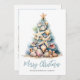 Get into the holiday spirit with this unique Christmas card featuring a Christmas tree made of shells and starfish. Perfect for sending beachy holiday wishes, this card is ideal for anyone living in tropical places like Florida, Hawaii, or the Bahamas, or for those who simply adore the beach look. The tree, topped with a starfish, is a delightful blend of blue and green hues, reminiscent of underwater coral. Set on a sandy base, this card has a charming rustic watercolor style. The combination of simple fonts and script typography gives it a casual yet elegant feel.