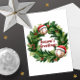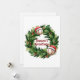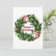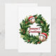 Esta tarjeta de Navidad única con tema deportivo presenta ilustraciones de una corona navideña de hoja perenne con béisbol con gorra de Santa. Mensaje personalizable de "Saludos de la temporada" en el centro.