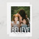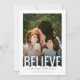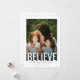 BELIEVE shines boldly across the front of this elegant holiday card, paired with IN THE MAGIC OF THE SEASON in a soft handwritten script for a warm, heartfelt touch. Clean white borders, classic typography, and a modern layout create a timeless design that beautifully highlights your favorite holiday photo. The bottom line includes fully customizable family text for a personal finishing detail. The back features space for an additional photo and message, giving you a stylish way to share more moments and send a meaningful holiday greeting to everyone on your list.
