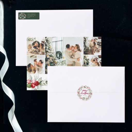 Celebre la temporada con nuestra tarjeta de Navidades muy personalizada, perfecta para compartir la alegría de su familia. La parte delantera de la tarjeta muestra cinco de tus fotos favoritas, creando una sincera muestra de momentos apreciados. Debajo de las fotos, un delicado ilustracion de baya acuática enmarca el saludo festivo "Feliz Navidad" con una elegante caligrafía, añadiendo un toque de encanto vacacional. En la parte de atrás, agregue dos fotos más y un mensaje personalizado, convirtiéndolo realmente en el tuyo propio. Ideal para las familias, esta tarjeta es una hermosa manera de enviar cálidos deseos y crear recuerdos duraderos. ¡Personaliza el tuyo hoy!