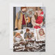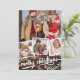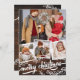 Tarjeta fotográfica de Navidad de doble cara con un collage de fotos de cuatro fotos -una más grande y tres más pequeña con marcos blancos cuadrados- contra grano de madera marrón oscura. Feliz Navidad está escrito en un guión audaz y rodeado de ramas de berry. En la parte posterior, agregue un saludo de Navidades junto con sus nombres.
