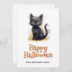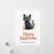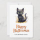 Feliz tarjeta de Halloween con un ilustracion acuarela de un gato negro. Personaliza fácilmente esta linda tarjeta de Halloween para los niños con tu apellido y texto.