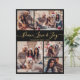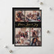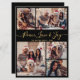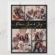 Elegante guión moderno negro y dorado 5 Collage de fotos "Peace Love and Joy" Navidades tarjeta de vacaciones. Esta plantilla festiva de cinco (5) tarjetas de felicitación para festividades incluye un collage de fotos de cuadrícula de bonito y en la parte posterior una (1) foto. El texto del saludo "Peace Love and Joy" está escrito en un hermoso tipo de letra con letras a mano giradas con cola rápida Calligraphy en dorado sobre fondo de color negro. Al revés con tu mensaje de bienvenida prefabricado con un pequeño motivo de corazón/doodle en blanco y una plantilla de fotos. Tarjeta de saludo de bonito para su familia y amigos en temporada de vacaciones para Navidades.