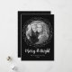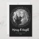 Tarjeta festiva negra con fotos rodeadas por un marco de círculo punteado blanco. "Merry and Bright" se muestra en un guión manuscrito en negrita y blanco con su nombre y el año que se muestra a continuación. La tarjeta se revierte a un patrón punteado blanco con un fondo negro.