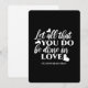 Comparte el mensaje atemporal de amor y fe con este audaz diseño blanco y negro que presenta el versículo de la Biblia de 1 Corintios 16:14: 'Dejen todo lo que se hace en el amor.' Ya sea por uso personal, decoración doméstica o un regalo reflexivo, este diseño basado en las Escrituras inspira amor y positividad en todo lo que se hace. Es un perfecto recordatorio del llamado de Dios a actuar con amor. #FaithAndLove #LoveInAction #1Corinthians1614