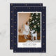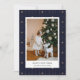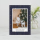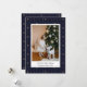 Holiday card featuring a blue and gold striped wallpaper background with one family photo paired with a holiday greeting and your name and year in a sans serif font.