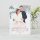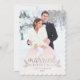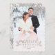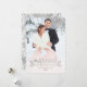 Elegante diseño de tarjetas de fotos de vacaciones para bodas de invierno incluye tu retrato boda favorito con un diseño de 'overlay de Navidades casados en color plata impreso digitalmente con un falso aspecto de Relieve metalizado. En la parte posterior de la tarjeta aparece una segunda foto y un texto personalizado. El diseño está inspirado en el follaje de pino moderno con bayas.