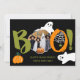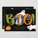 Prepárate para enviar saludos espumosos con esta adorable tarjeta de saludo familiar "Boo!". Esta tarjeta de personalizable presenta un diseño lúdico con texto en negrita "Boo!" en blanco, verde y naranja, con ilustraciones fantasma y de calabaza que le dan un toque festivo. El centro de la tarjeta es el lugar perfecto para una foto familiar, lo que la convierte en un placer divertido y personalizado. La parte trasera de la tarjeta continúa con el tema de Halloween con un espacio de mensajes amistoso, rodeado de figuras más fantasmales y elementos de Halloween donde puedes añadir otra foto. El fondo rosa pastel hace que los colores brillen, creando un aspecto cautivador y alegre. Ideal para compartir los deseos de Halloween, esta tarjeta combina la amabilidad y la fantasía en una plantilla deliciosa.