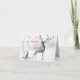 Una tarjeta de Navidad alegre pintada con acuarelas que presenta un reno de grandes cuernos en una escena borrascosa de bosque invernal nevado con amigos, la liebre y un par de pájaros carboneros de capucha negra con las palabras, "Feliz Navidad", en una fuente manuscrita roja animada en la parte frontal.