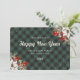 Green buffalo plaid New Year card featuring falling snow and a watercolor painting of poinsettia, holly and red berries. Easily personalize online.