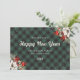 Green buffalo plaid New Year card featuring snowflakes and a watercolor painting of poinsettia, holly and red berries. Easily personalize online.