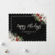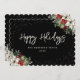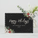 Tarjeta Black Happy Holidays con un marco de nieve adornado con poinsettia blanca, con bayas rojas y otras zonas verdes. Personaliza fácilmente esta elegante tarjeta de vacaciones con tu texto.